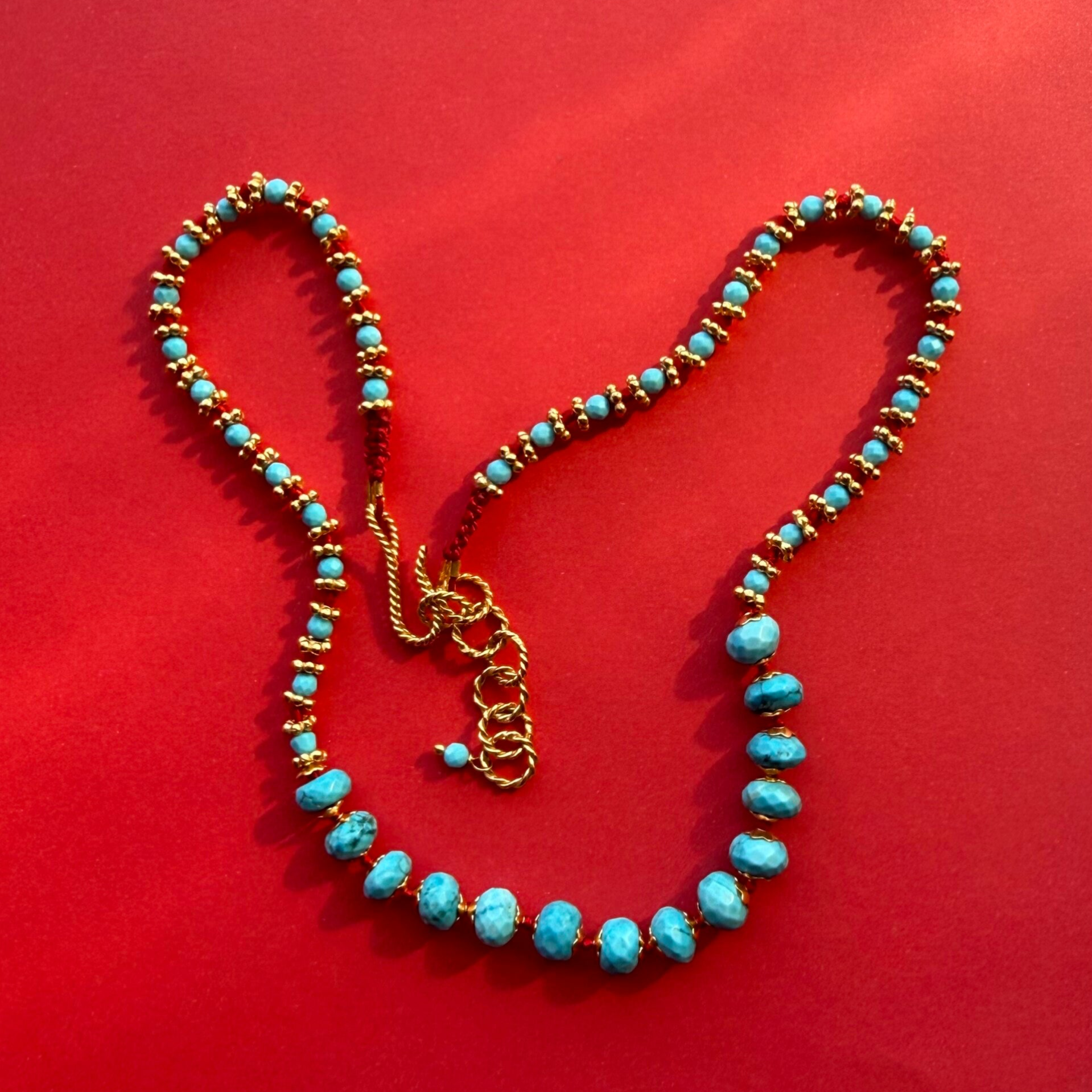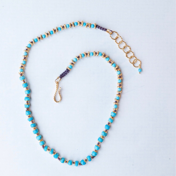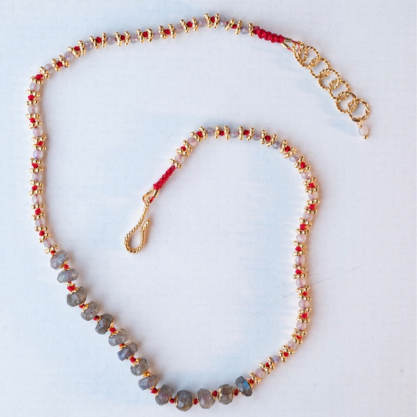 This necklace has an incredible level of craftsmanship as the stones, charms, and knots are interspersed in a special rhythm. Being made with cord gives it flexibility, comfort, and allows for endless colors to combine with the different stones.
