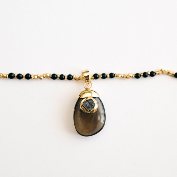The pendant, made of smoky quartz, is hand-polished and inset with a raw Iolite crystal.