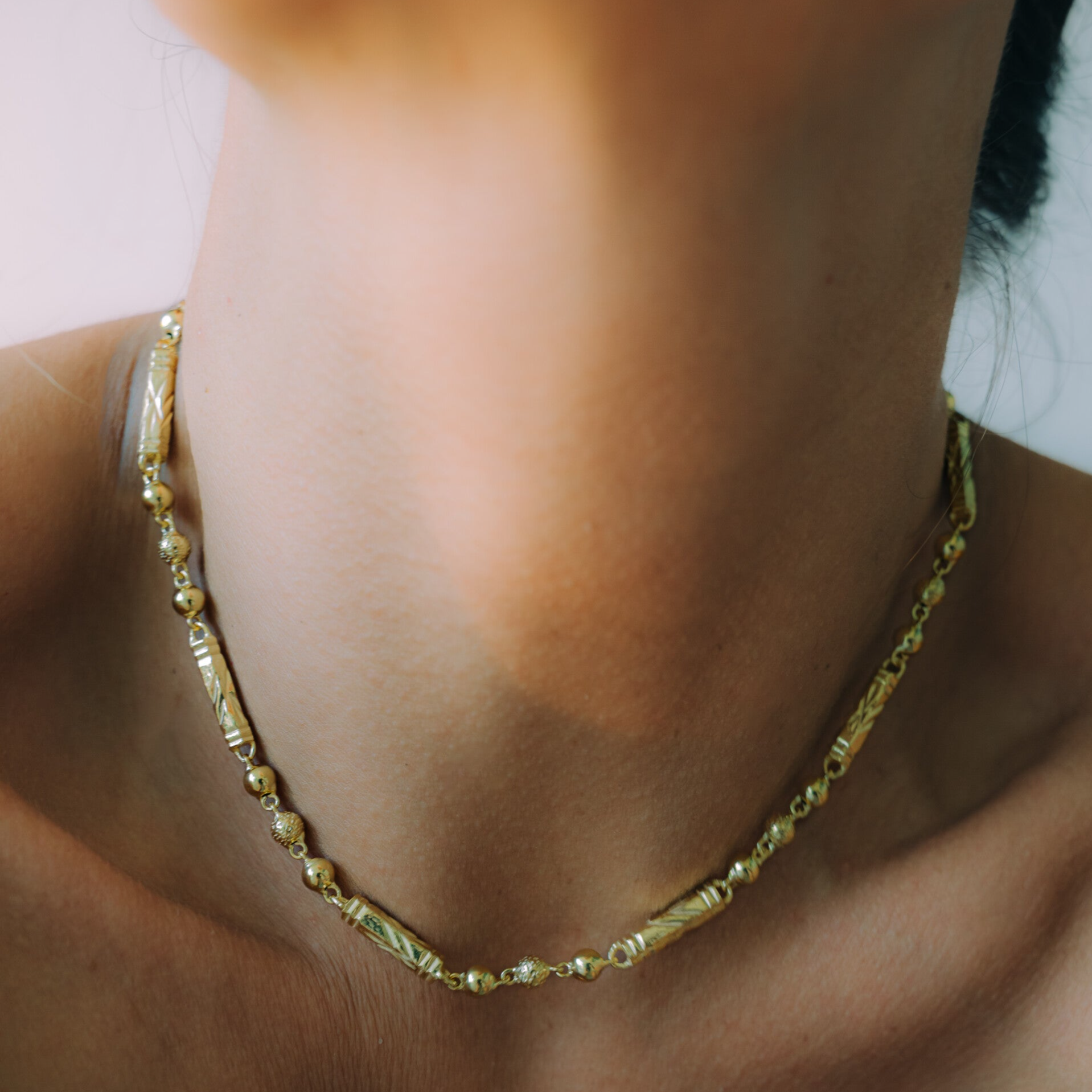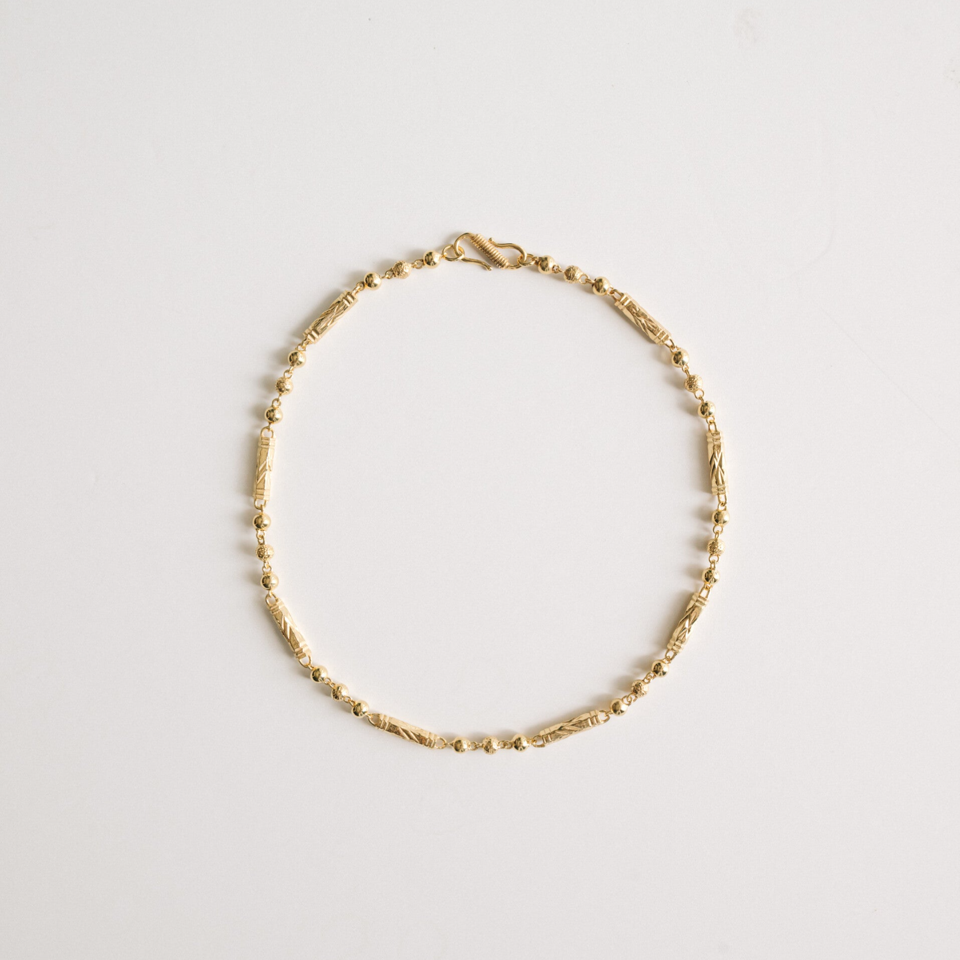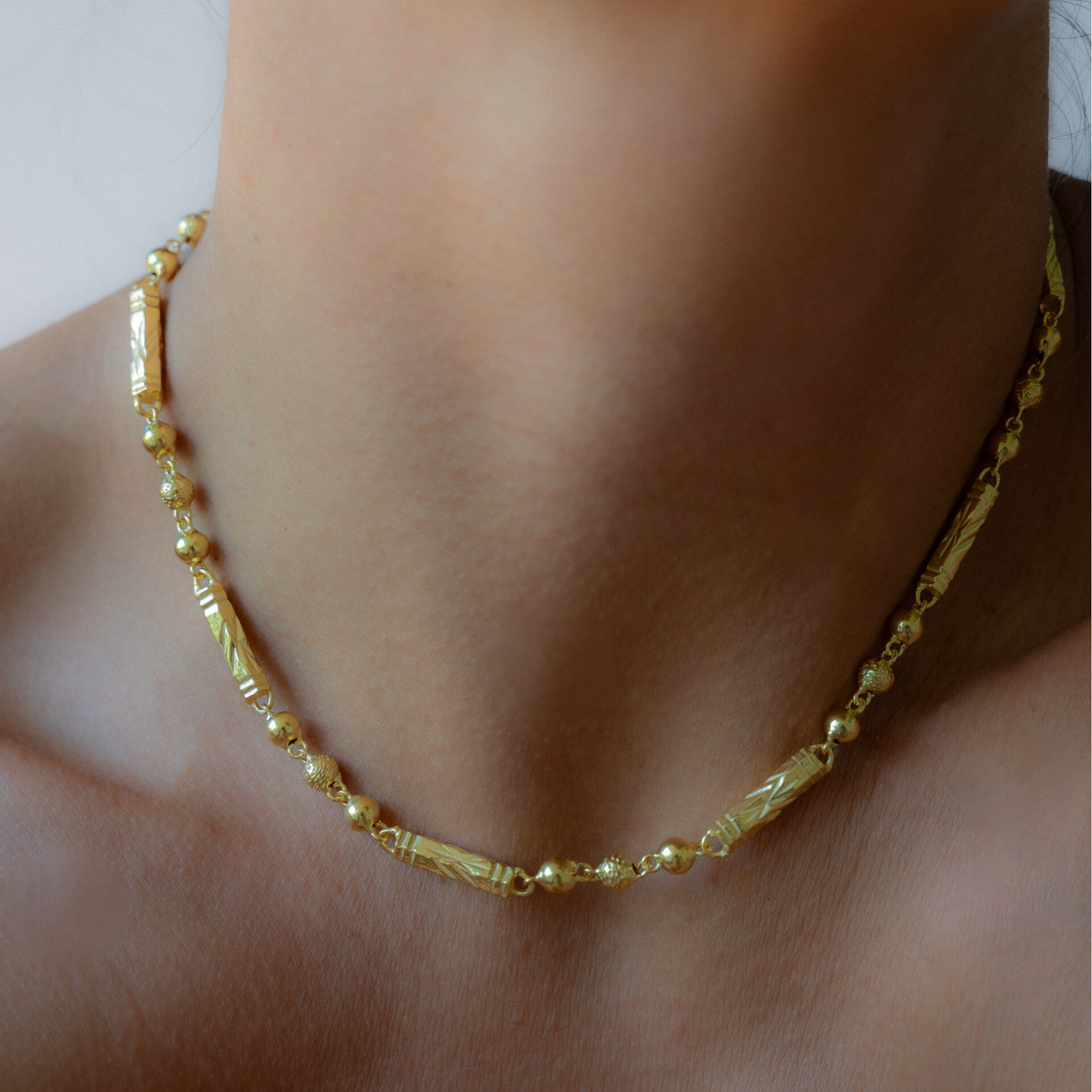 This chain is a work of art to me, especially because of the way it is hand-carved link by link. It represents a bit of Indian culture to me in terms of its shapes, carvings, and history. It’s a chain to wear alone and make a difference, or for those who like to wear multiple necklaces, it will undoubtedly be the standout piece. It is proposed to be worn very short as the first layer.