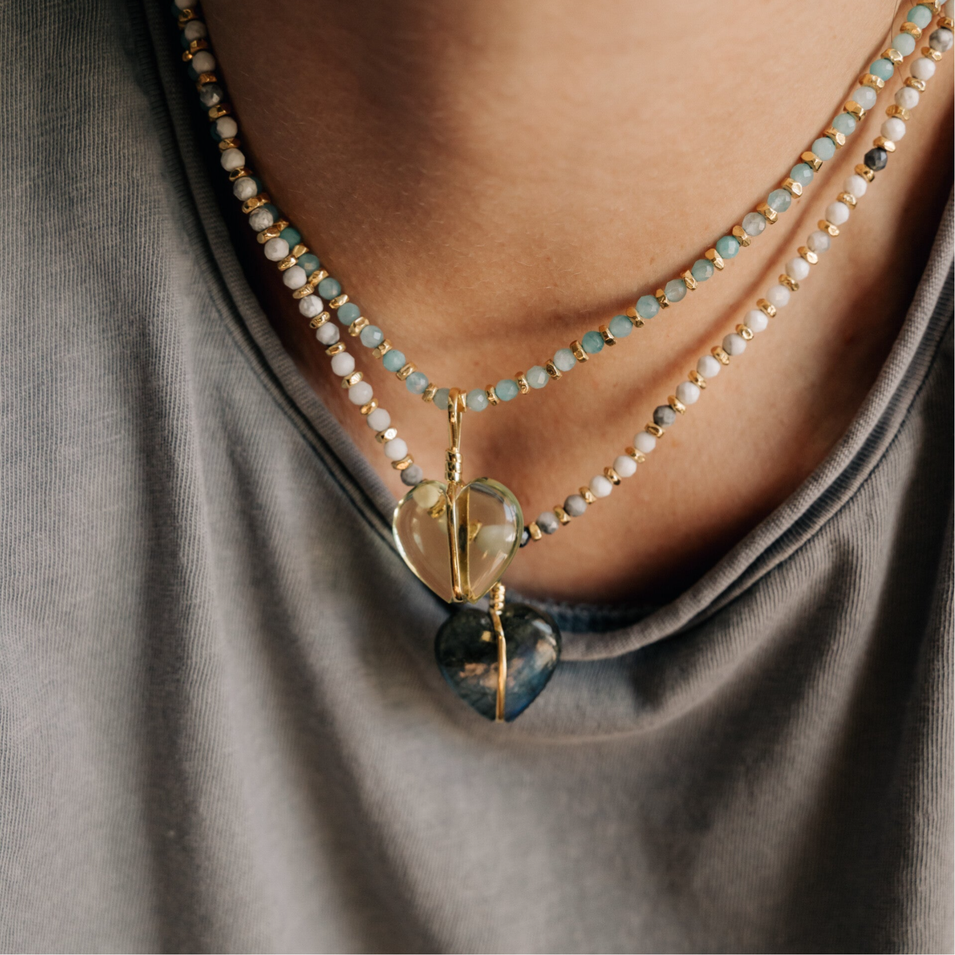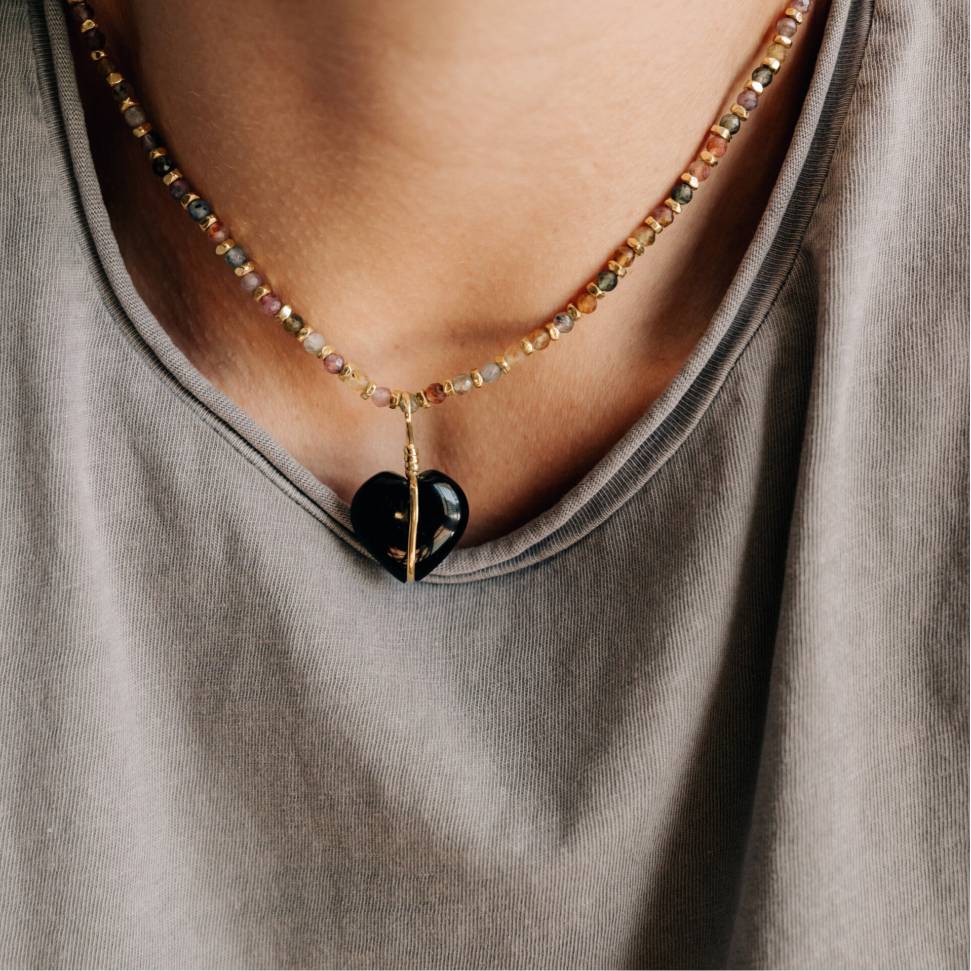 This pendant is an icon of the brand and, to me, best represents our intention to connect and find meaning in what we wear. It's not just that heart, whose shape you know fascinates me, but also choosing the stone that resonates most with you. Each heart has a stone chosen for its powers and characteristics. Each person then chooses the one they need. In essence, the intention is for everyone to find their heart to wear every day… They are not sold loose but with a chain or necklace. The combinations are endless, and finding the one you like is a revealing journey. We recommend offering them with the Cherry necklaces, a signature combination of the brand, and the Chennai necklaces. In the latter case, both short and long add a different texture to any layer with their great mix of stones, metal, and cord.