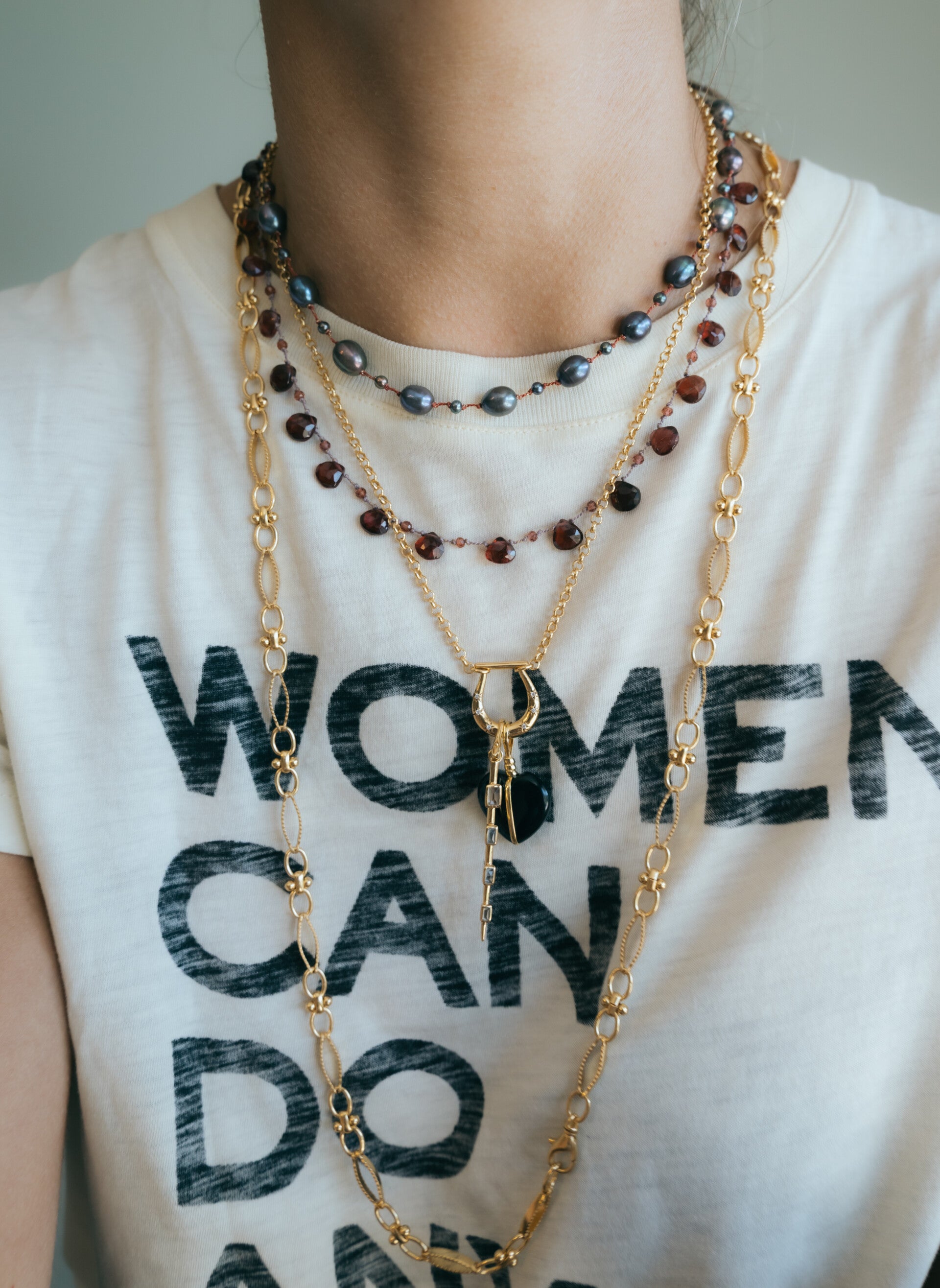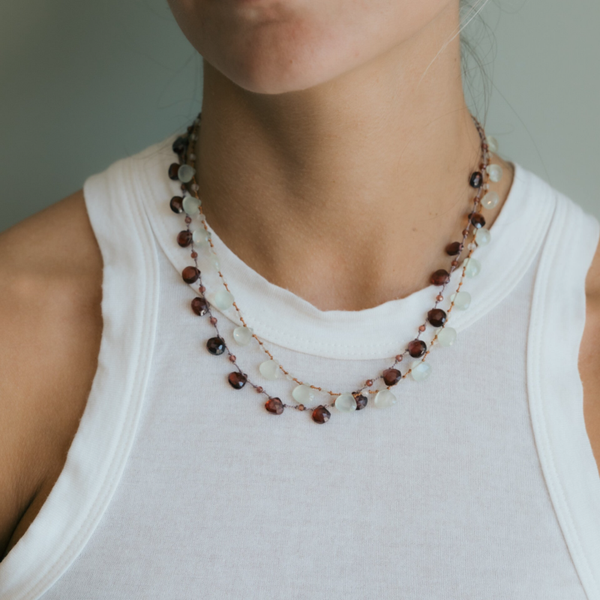 One of the coolest things about this necklace is its crafting method. Each stone is knotted with a millimetrically controlled distance. Many stones together, but in a way that is not overwhelming, quite the opposite. It is subtle, yet original. The use of cord instead of chain makes it very modern and easy to combine with any other more metallic option. Its size is specifically designed to act as a second layer in a composition.