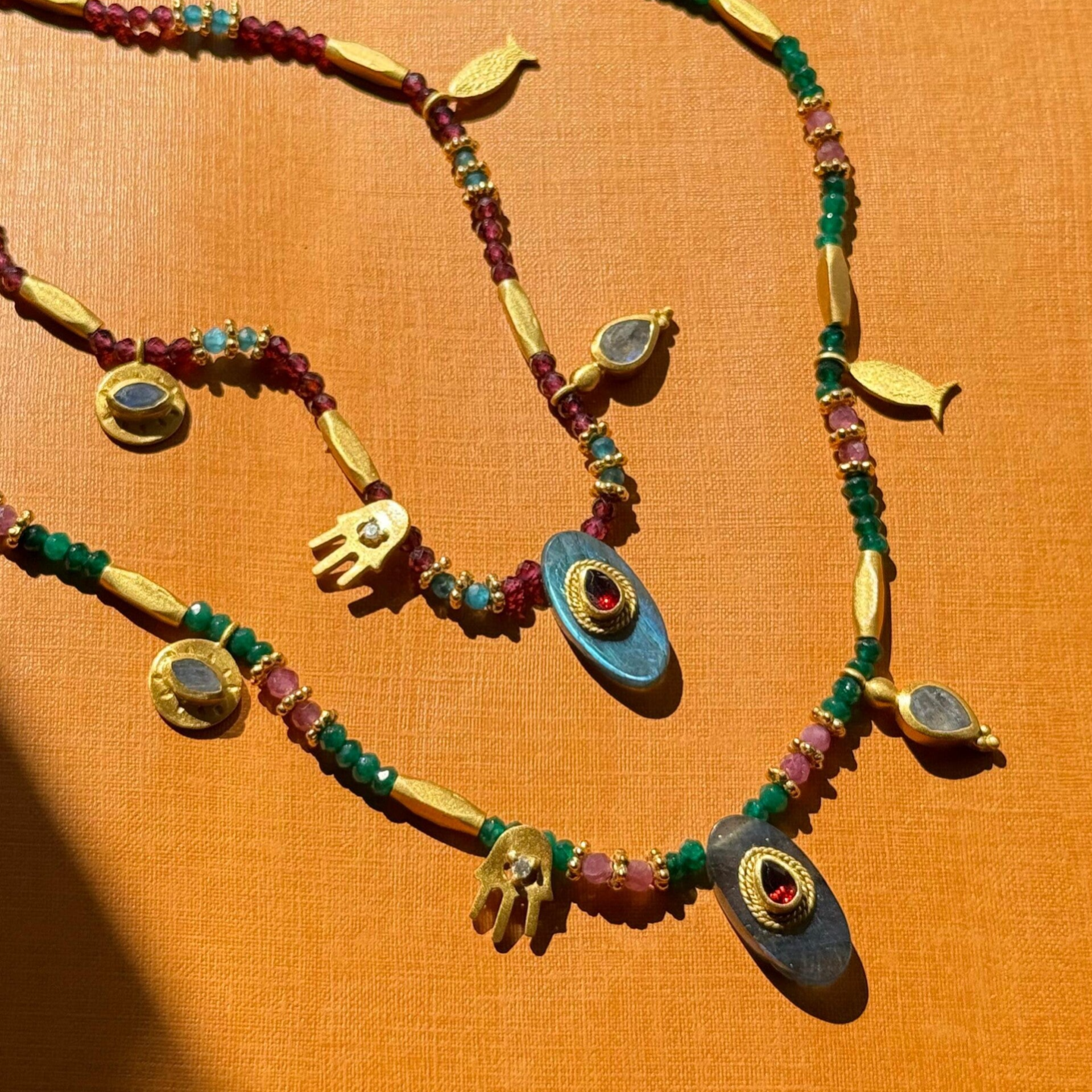 This option is for those who don't necessarily like to wear many necklaces, but want the one they choose to stand out. That's why it has so many charms, each with its own meaning. The emerald and garnet bases are two of the most successful stone combinations in terms of sales.