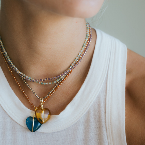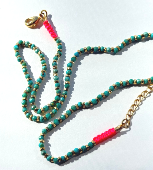A counterproposal to our undisputed best seller: the Cerezo necklace. The mini Cerezo maintains that delicacy in the details and its finishes, the flexibility provided by the cord, and the contrasting shine of a stone and the metallic beads. In my opinion, being everything smaller makes it much more delicate. It is available in new stone proposals, adding more colors and options for combining.